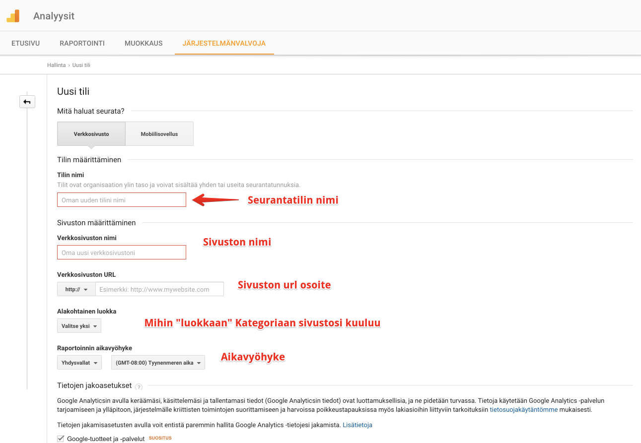Järjestelömänvalvoja välilehden alla löydät alasveto valikon missä näet kaikki sivusi mitä on kytketty google analytiikkaan. Alasveto laatikon alalaidassa on nappi Luo uusi tili