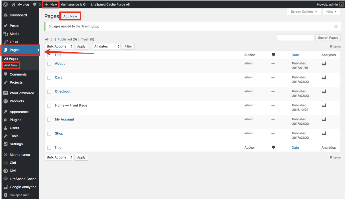 Kun klikkaat Pages välilehteä vasemmasta laidasta pääset näkemään kaikki sivustosi sivut. Tästä näkymästä pääset muokkaamaan yksittäistä sivua tai luomaan uusia.